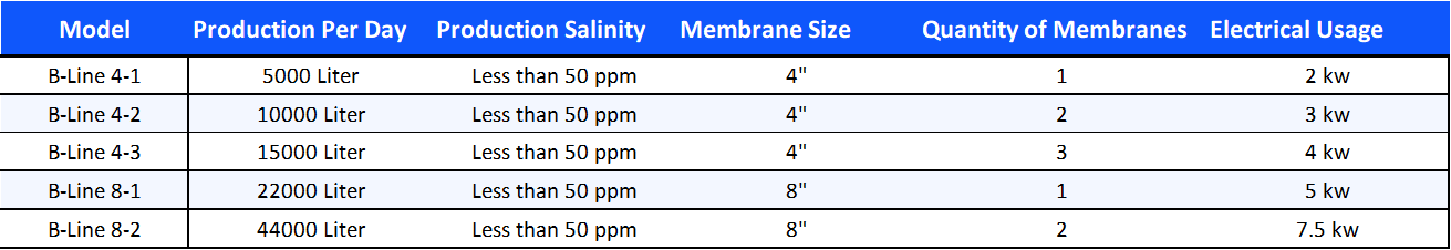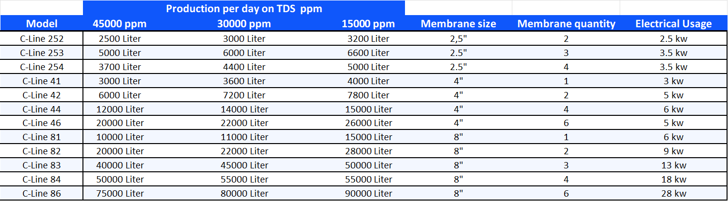 Note : Feed salinity less than 10000 ppm - product salinity less than 50 ppm.